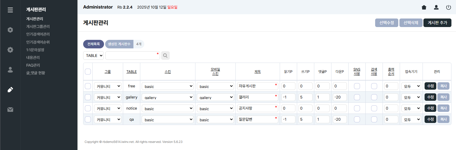 메뉴를 설정하고, 게시판 스킨을 변경하신 다음