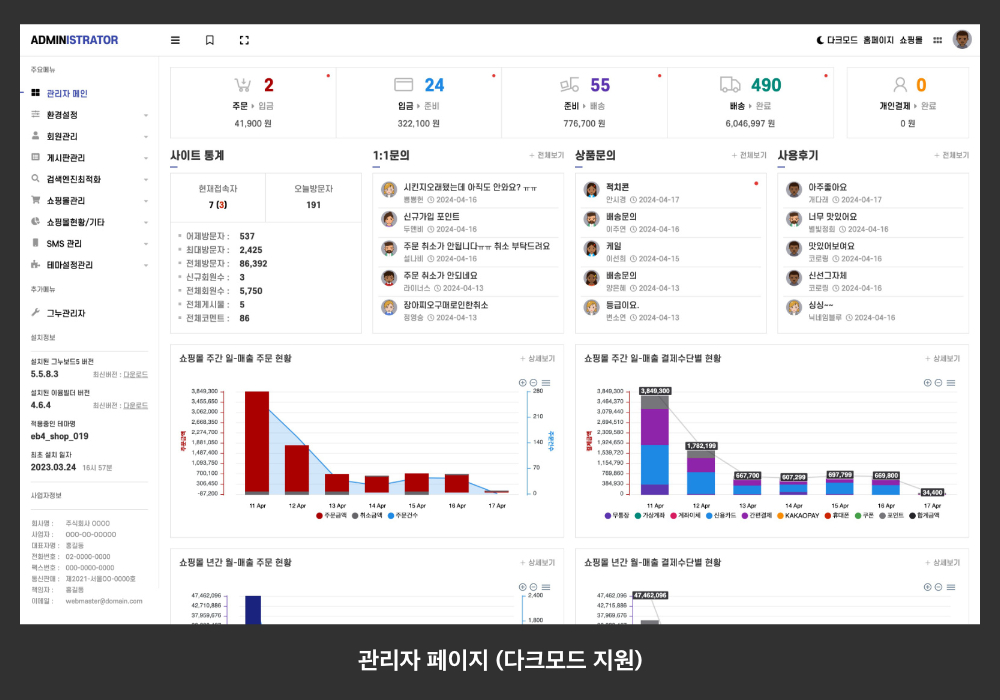 이윰빌더 4.7.* 버전부터는 새로워진 기본 베이직 테마와 관리자 페이지를 경험하실 수 있으며, 나이스페이를 탑재한 그누보드(영카트) 5.6.4 정식버전을 이윰빌더에 적용하였습니다.