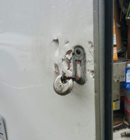 일나가려고 트레일러에 가보니 누가 문을 작살을 내놓고 전동Tool을 몽땅 훔쳐 갔네요.