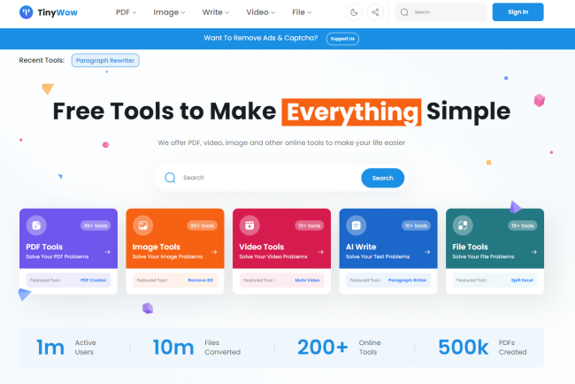 PDF, 이미지, 글쓰기, 영상, 파일에 관련된 다양한 툴을 무료로 한 곳에서 이용할 수 있는 사이트입니다.