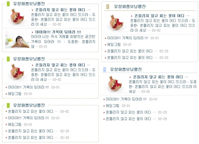 그림의 왼쪽부분의 녹색계열 3개는 같은 최신글스킨 latest_morningWebU_GB 입니다.