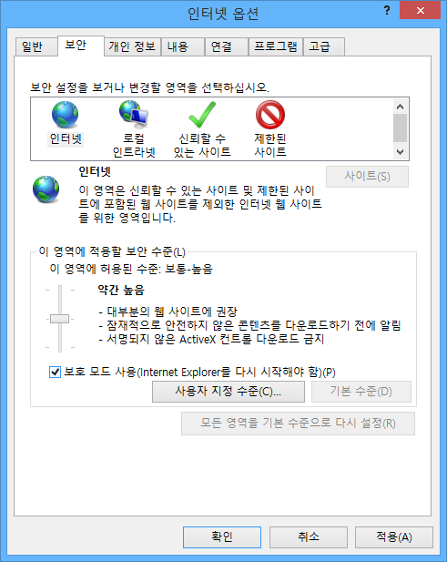 Cheditor 5.1 업데이트 후 내 PC 사진 추가 버튼이 없어지는 경우 정보 Cheditor 5.1 업데이트 후 내 PC 사진 추가 버튼이 없어지는 경우 흰발톱 자기소개 아이디로 검색 회원게시물 자기소개 아이디로 검색 회원게시물 2014.04.18 19:28:51 조회 5,300 댓글 0 이전 게시글 다음 게시글 목록 본문 익스플로러 10 이상이면 [ 인터넷 옵션 - 보안 ]에서 [보호 모드 사용]을 해제하고 익스플로러를 재실행해보세요. 그럼 짜~잔~ 하고 문제가 해결될 수도 있습니다. 추천 0 댓글 0개 이전 게시글 다음 게시글 목록