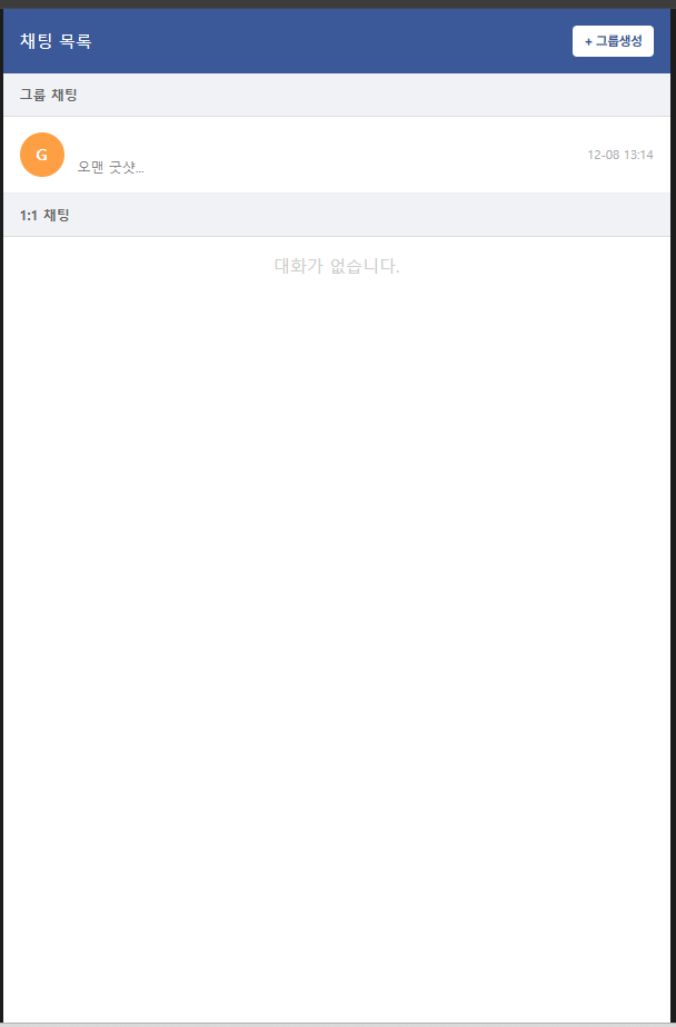 경로로 실행하고 1번이라도 메세지를 주고 받으면 채팅방이 생성되는 구조 입니다.