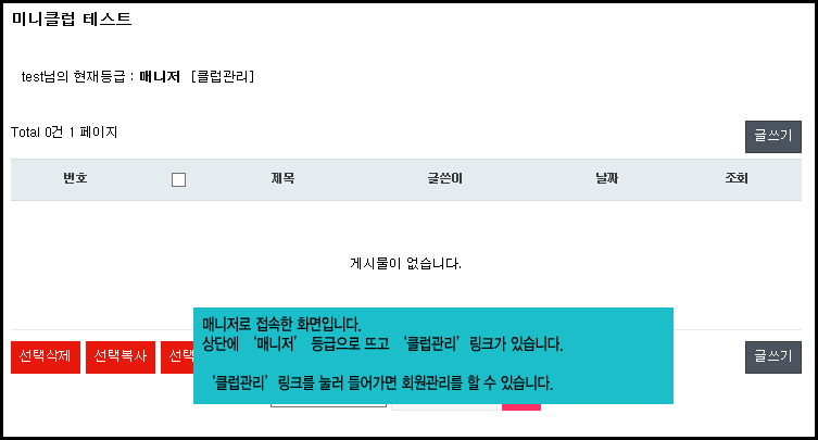 3. 게시판 관리자로 지정된 회원은 자동으로 해당 미니클럽의 매니저로 연동됨.