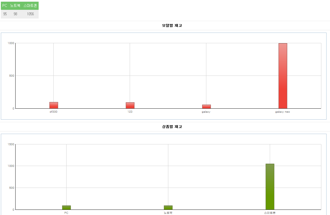 질문2: 재고 현황에서 View 를 누르면 모델이나 상품별 재고를 그래프로 나와야 되는 것 같은데 등록된 글일 없습니다라고 나오고 그래프만 보이고 모델이나 상품은 표시가 안되는 것을 보면 문제가 있는것 같은데 이건 어떤 파일 어느 부위를 손봐야 할까요?