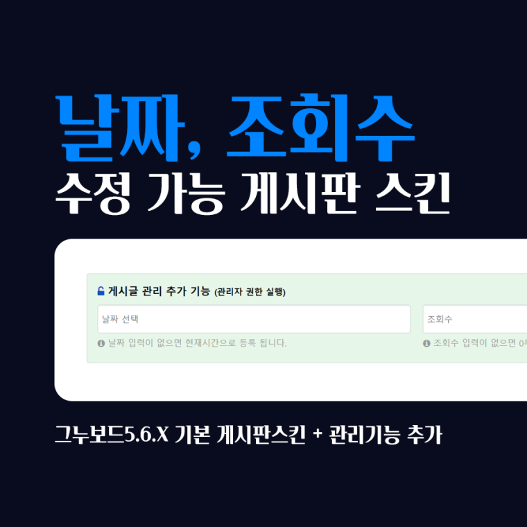 글쓰기 또는 글수정 단계에서 게시글의 등록일시(날짜) 및 조회수를 임의 지정 또는 수정 가능한 게시판 스킨입니다.