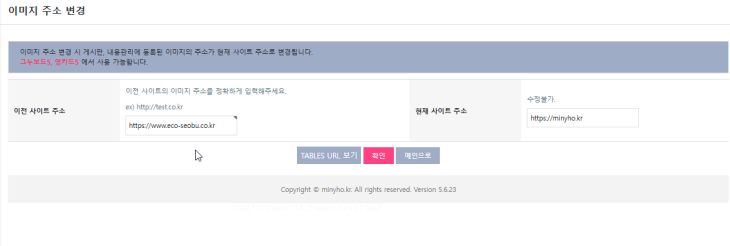 ['999100', '이미지 URL 주소 변경', G5_ADMIN_URL . '/update/img_rename.php', 'min'], 확인 누르면 모두 오케이, 모든 목록도 확인 가능. |
