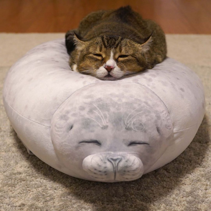 물범 인형 위에 고양이 정보
