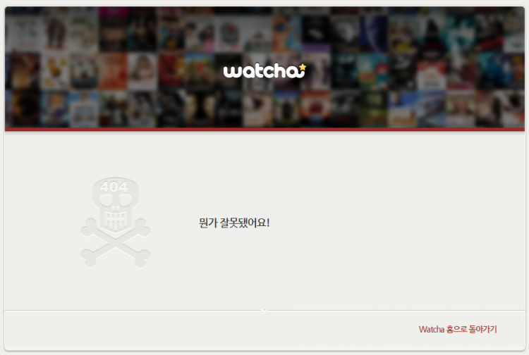 왓챠의 경우 404 해골 마크와 함께 뭔가 잘못되었다고 말합니다. 그리고 왓챠 홈으로 돌아가게 유도하죠. 사실 완벽하다고 볼 수는 없지만 좋습니다. 재미있다면 오류페이지가 나와도 기분이 나쁘지 않습니다.