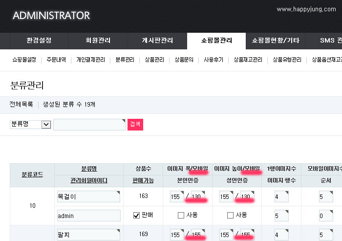 [관리자] 쇼핑몰 분류관리에서 모바일 이미지 크기 조절
